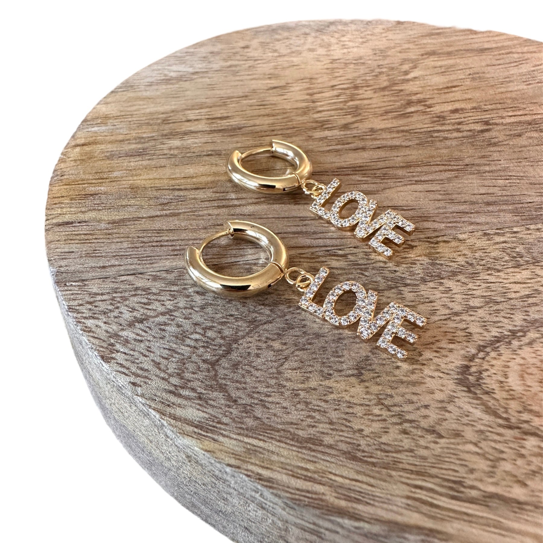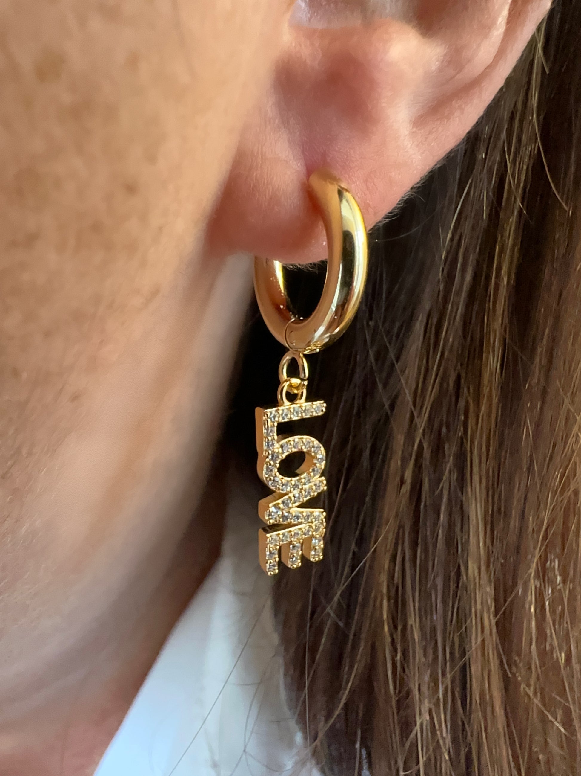 - Boucles d’oreille anneaux avec des pendentifs Love en strass