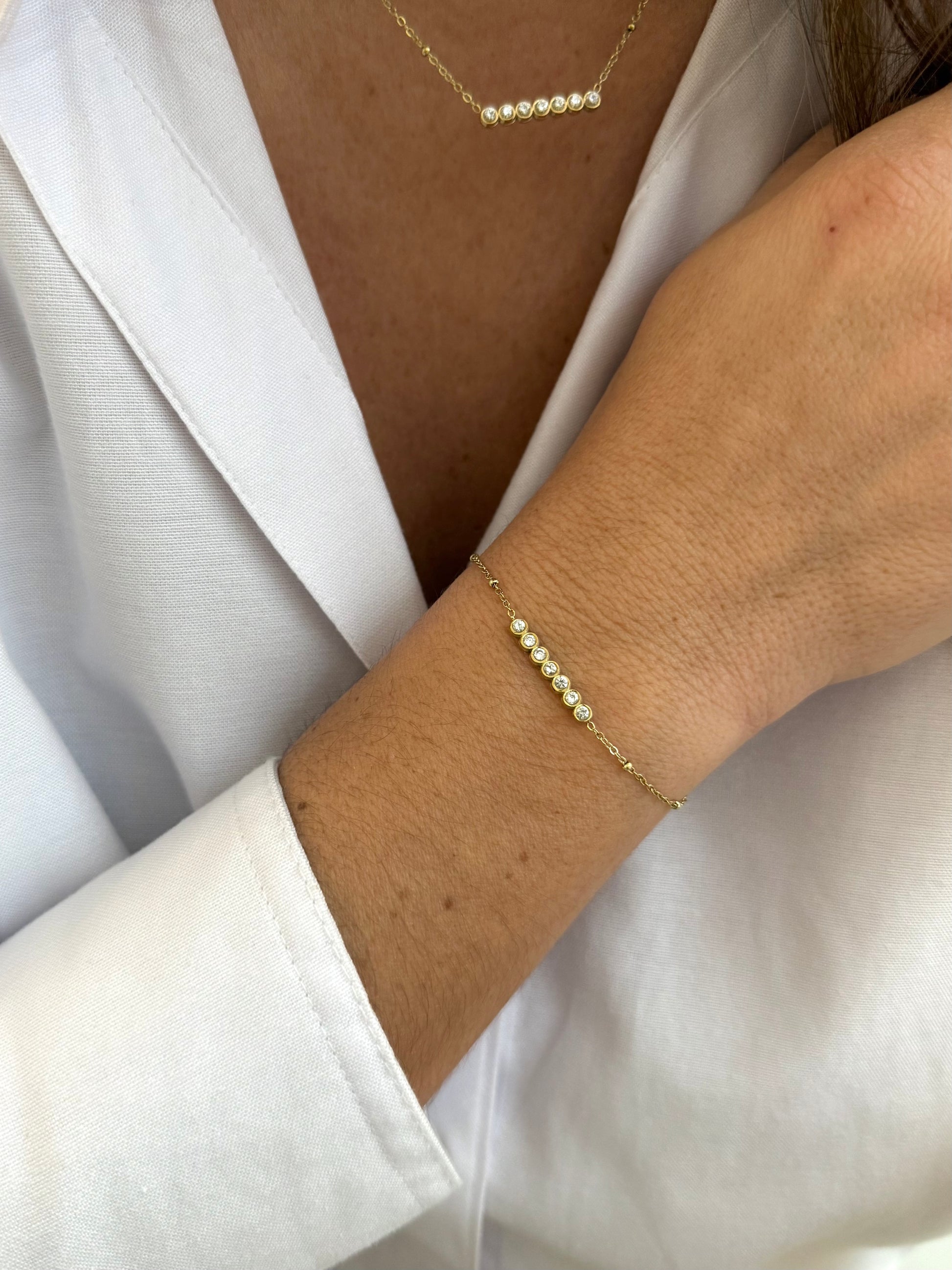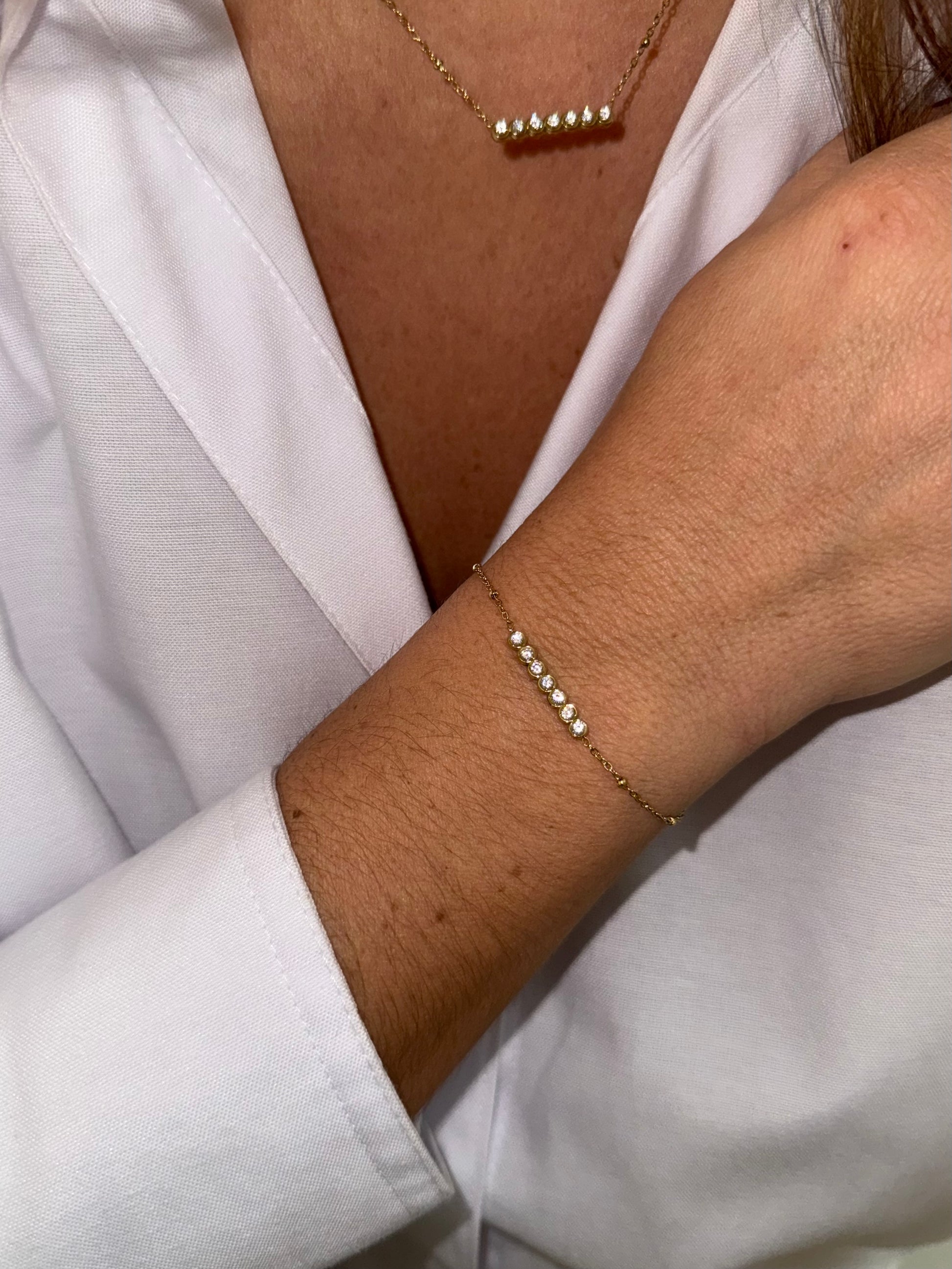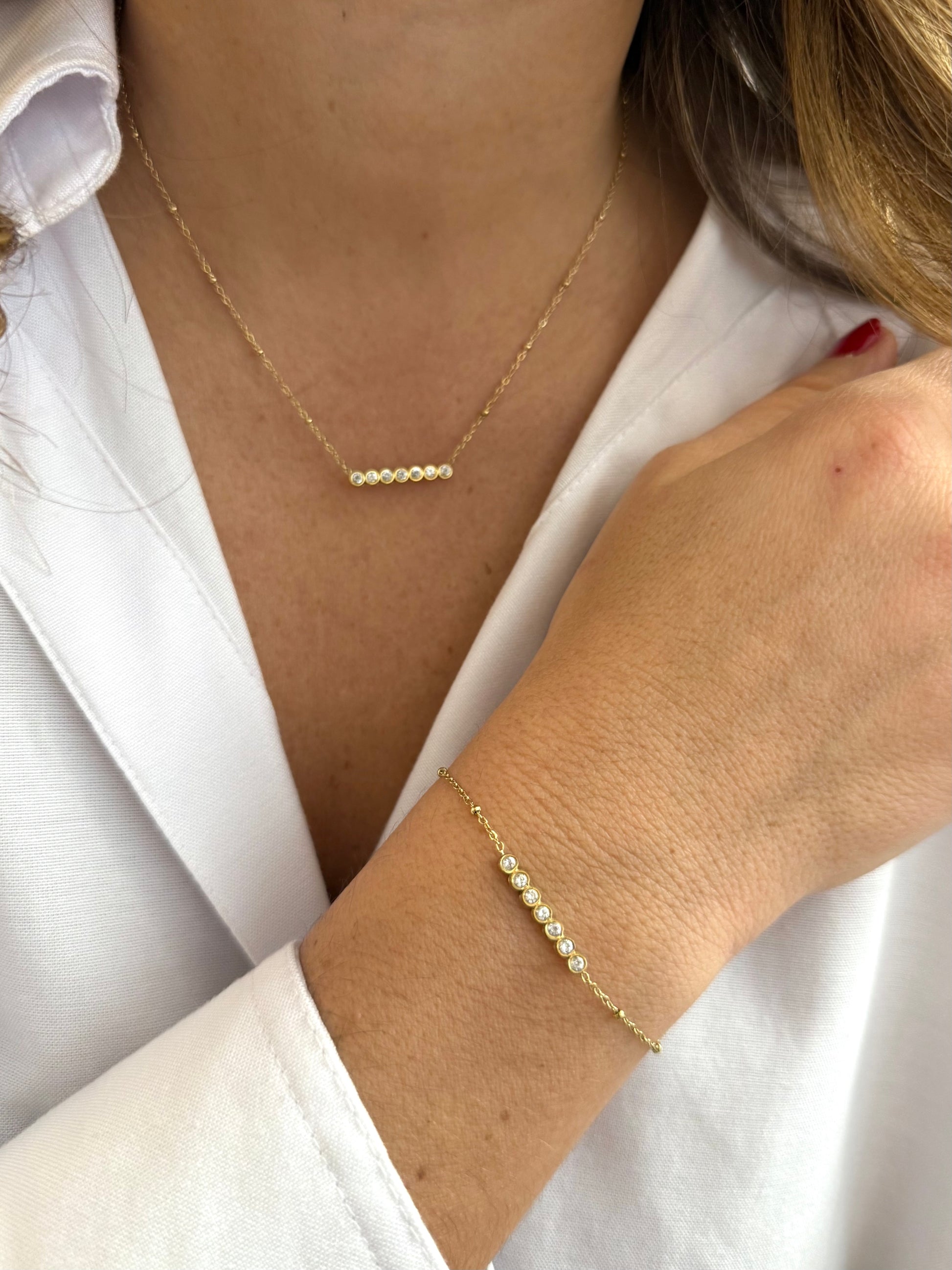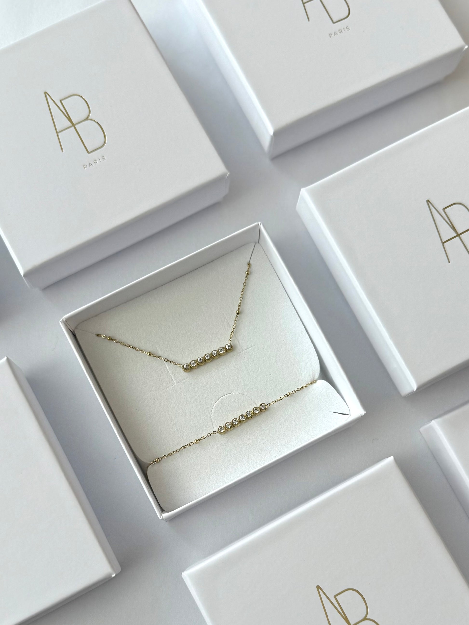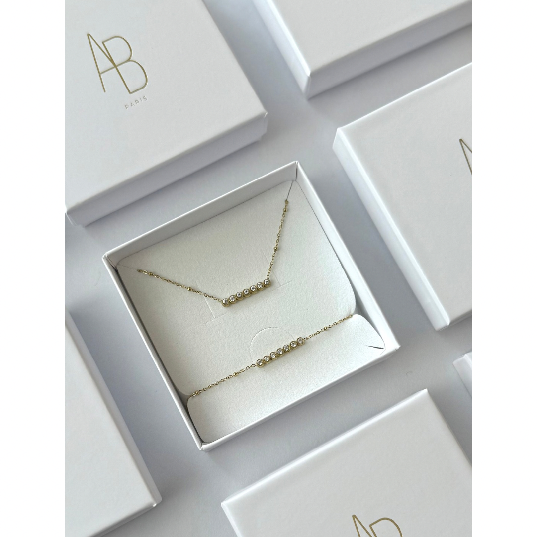 - Ce duo est composé d’un collier et d’un bracelet en chaîne ornés d’une baguette en strass