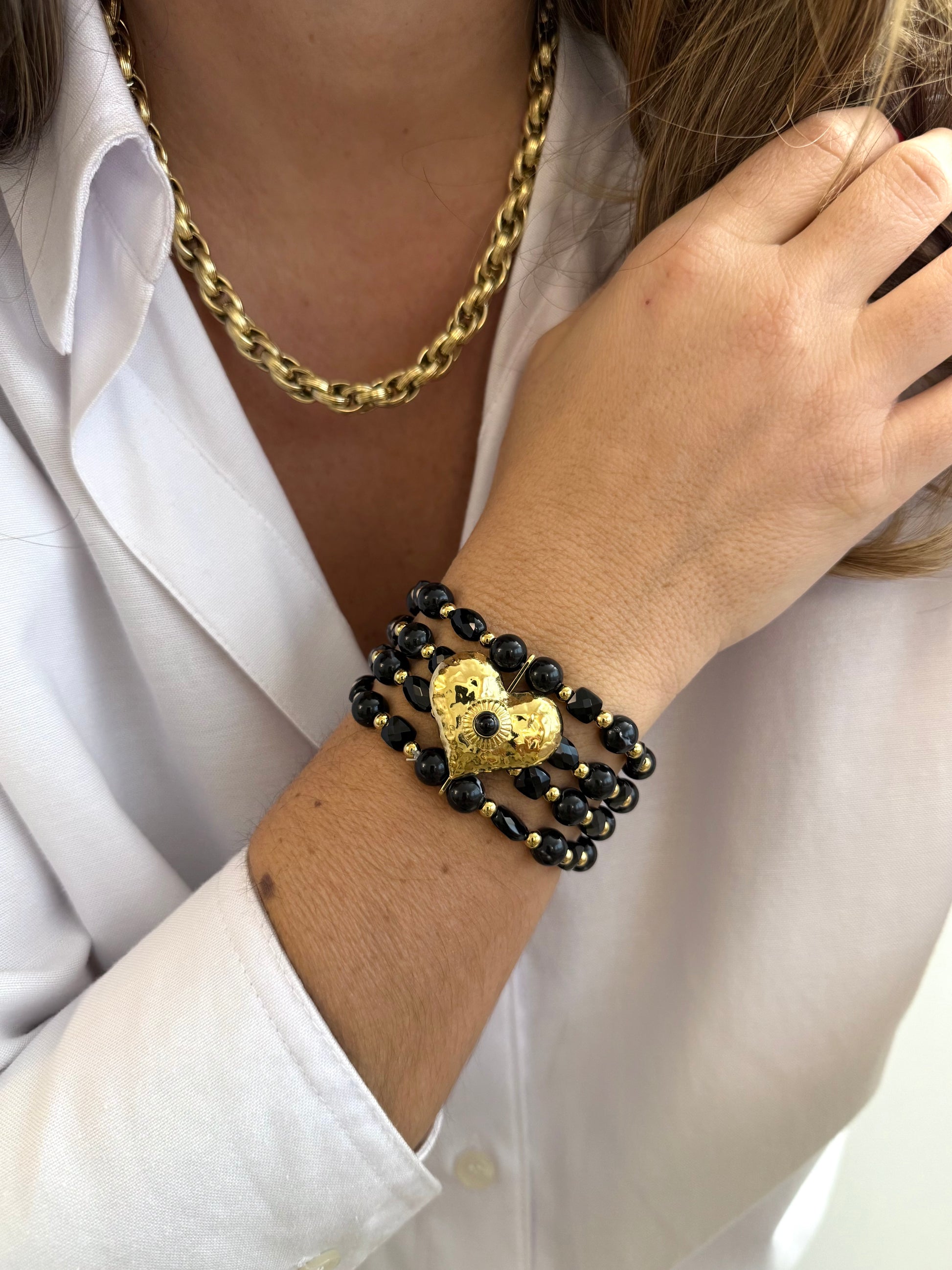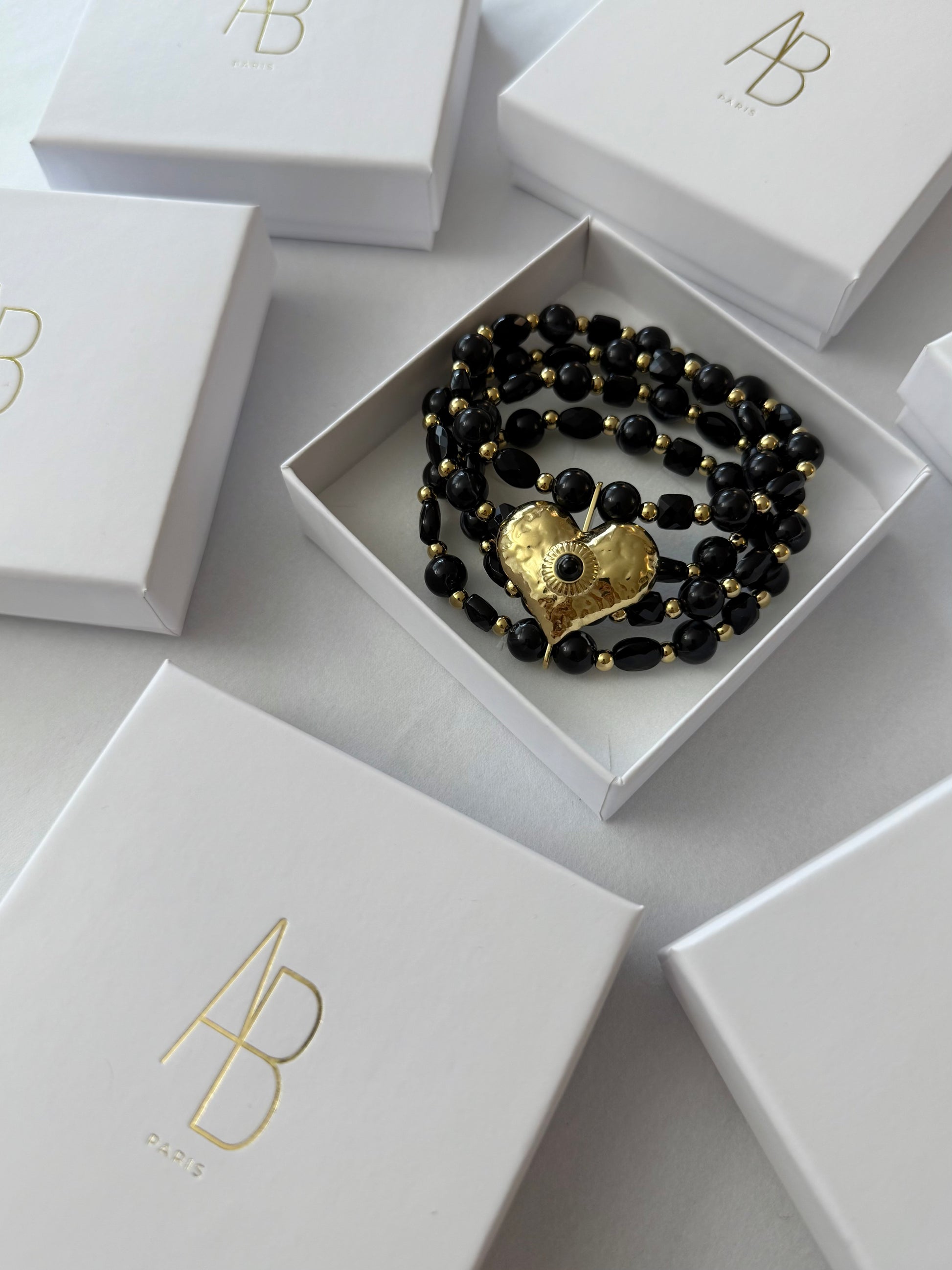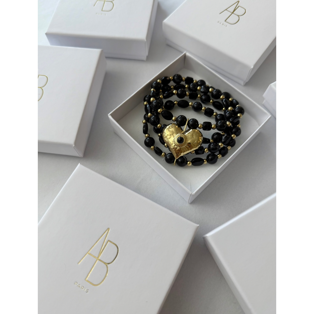 - Ce coffret est composé d’une manchette élastique en perles, avec un gros cœur reliant les quatre rangs